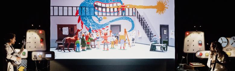 « Panique !! » est un tout nouveau ciné-concert ! Piochés dans le recueil Panique Tous Courts (2017 - Réal. Vincent Patar et Stéphane Aubier) issu de la série Panique au village, les trois courts-métrages mis en musique par Temps Calme regorgent d’humour loufoque, de génie créatif et d’animation stop motion évidemment ! Synthétiseurs, guitare, voix, percussions, sons concrets ou extraits sonores modelés pour devenir rythmes : les composition électro et pop créées pour l’occasion sont la bande-son idéale des péripéties de Cowboy, Indien et Cheval.