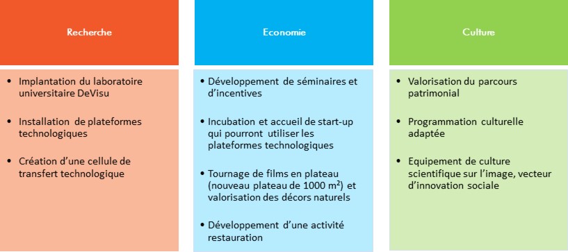 Aujourd’hui, les chercheurs du Laboratoire de recherche universitaire DeVisu y sont installés ; tout tournage peut y être accueilli dans des conditions optimales (cf équipements très innovants) et les agences événementielles, les entreprises ou les associations peuvent y organiser leurs événements professionnels ou grand public.